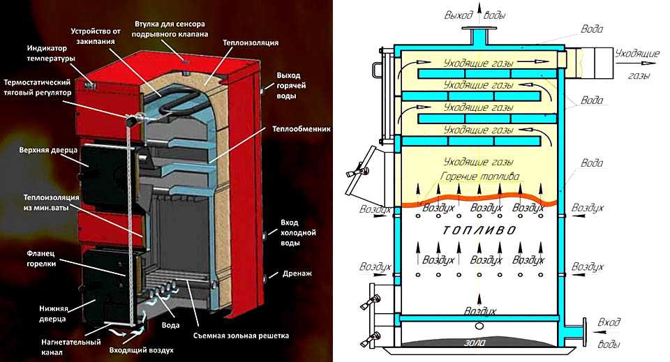 Котлы с нижним горением В этом типе отопительных агрегатов газогенераторная камера находится снизу, а пиролизные газы поднимаются вверх под воздействием тяги. Для устойчивого горения таким котлам необходим дымоход высотой не менее 5 метров.