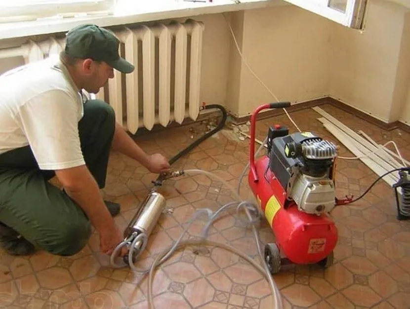 - Гидравлический тест – перед заполнением системы ее нужно опрессовать. Делается это с помощью специального прибора, который нагнетает давление и наполняет сжатым воздухом все трубы и батареи. Опрессовка выполняется под давлением на 25% больше базового давления для конкретной отопительной системы.