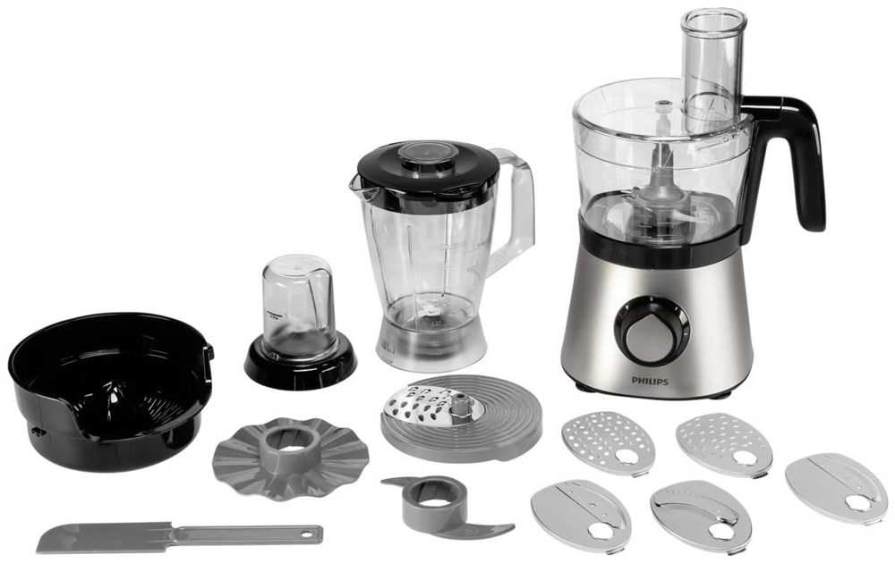 Последнее достижение компании Philips — серия Aluminium Collection. Название говорит за себя: вид у комбайна респектабельный, корпус — темно-серый матовый алюминий, детали сделаны из безопасных ударопрочных пластиков. Двигатель 1000 Вт обеспечивает работу нескольких скоростей, при этом нескользящие ножки удерживают прибор на месте.