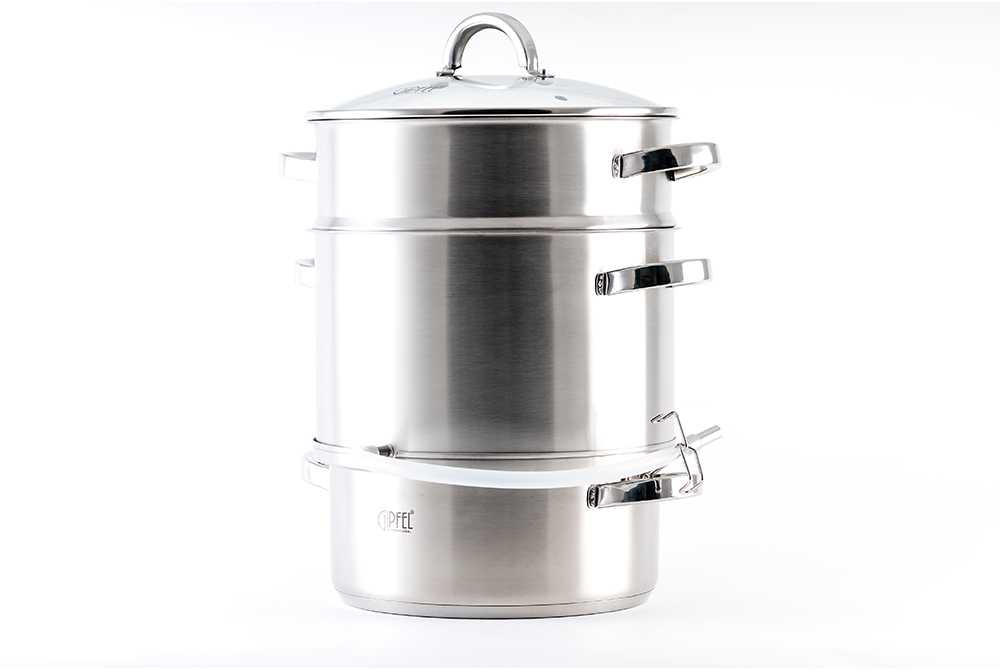 Использовать трехъярусную посуду можно не только для соков, но и для приготовления на газу полезных паровых блюд. Чтобы превратить посудину в пароварку, просто отложите в сторону среднюю емкость, на кастрюлю с водой установите дуршлаг, если позволяет конструкция. Некоторые современные модели так не собираются.