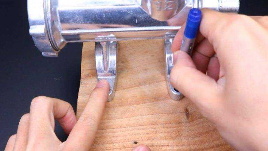 Маркером отмечаем места крепления мясорубки к доске. После чего просверливаем сквозные отверстия через основание. Закрепляем болтами, гайками с широкопольными шайбами. Стараемся не перетягивать.