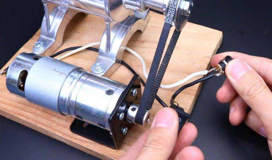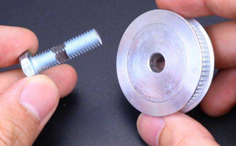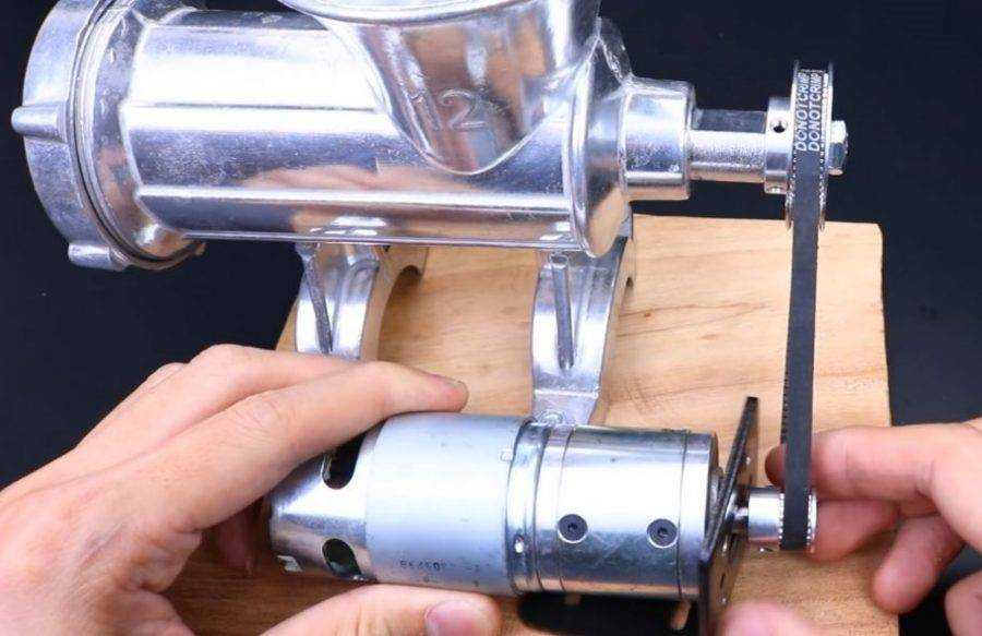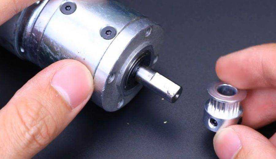 Коллекторный двигатель обязан быть с понижающим редуктором. Шестерни — металлические, так как нагрузка при работе высокая. Далее на вал редуктора надеваем шкив небольшого размера. Закрепляем болтиком вместо шпонки.