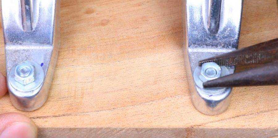 Маркером поставьте метку для отверстия снизу. Если оно диаметром примерно 10 мм, то необходимо отступить от начала резьбы примерно 8 мм. Расстояние корректируется с учетом размеров втулки, она не должна создавать проблемы во время закручивания гайки при сборке мясорубки. Мы приводим примерные параметры, точные подбирайте самостоятельно в зависимости от характеристик деталей.