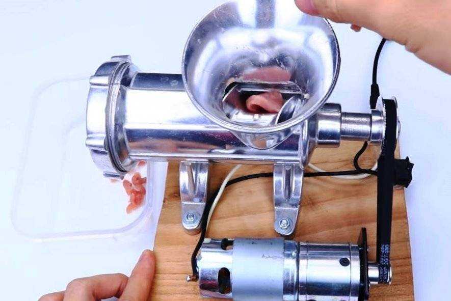 Подаем питание и мясорубка заработала. Стоимость самодельного аппарата окажется чуть ниже бюджетных китайских аналогов, а прочность достаточна для обработки любого мяса. Однако ей не хватает реверса и с этим придется мириться.