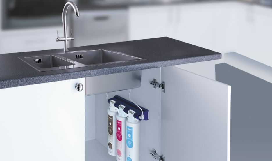 Оптимальное место для установки проточного фильтра – это пространство под мойкой. В этом случае получится одновременно разрешить сразу несколько проблем: