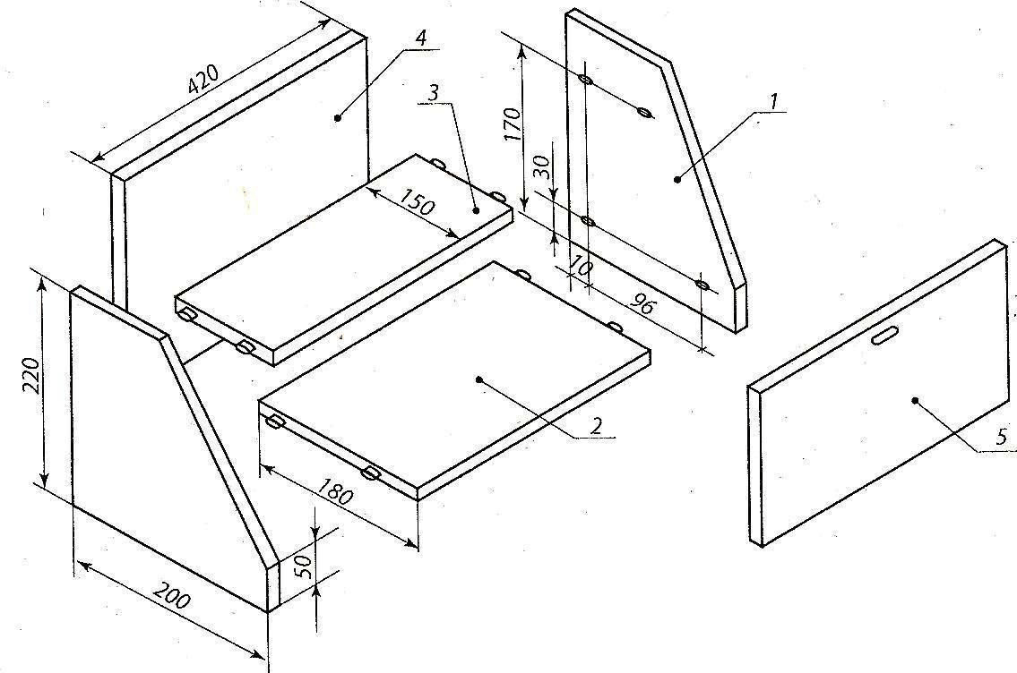 Из доски выпиливаем две боковины, дно и верхнюю планку (см.рисунок).