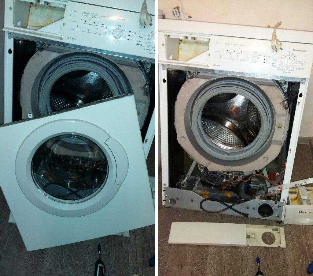 После последовательной разборки агрегата и извлечения бака, с помощью специального съемника или подручных средств, элементы выбиваются, зачищаются посадочные места, проверяются ремень, крестовина, геометрия барабана и исправность прочих деталей. Для облегчения демонтажа желательно использовать аэрозоль WD-40.