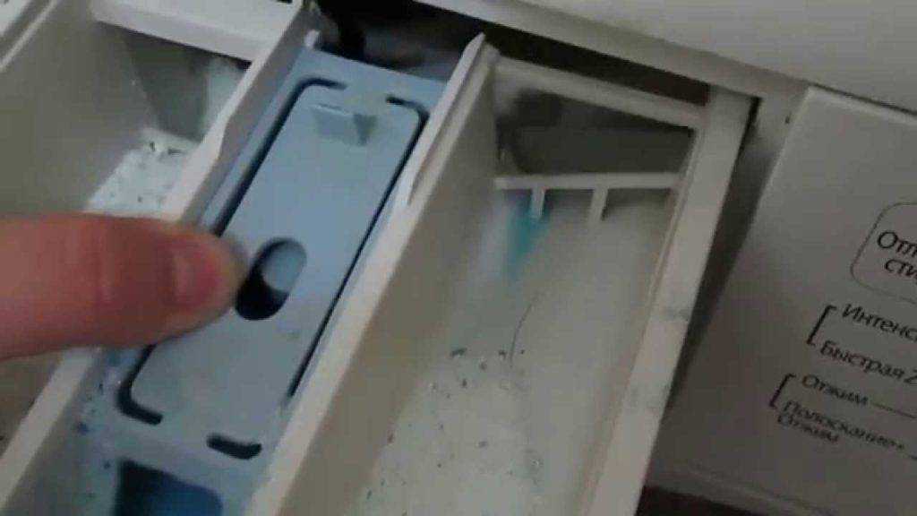 Вытащите лоток для моющих средств, нажав на фиксатор в центре.