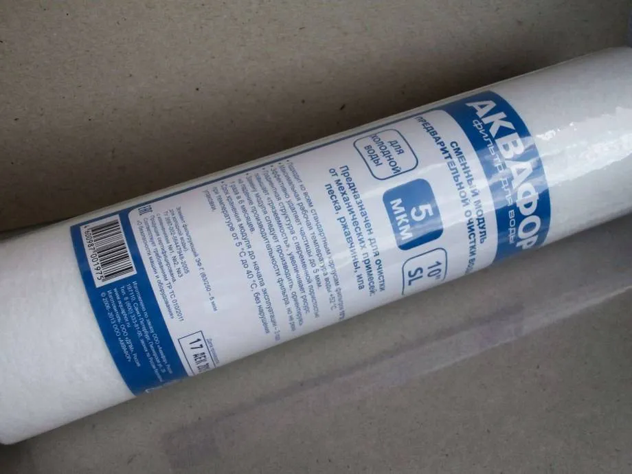Картридж имеет цилиндрическую форму, изготовлен из полиэтилена, картона, полипропилена и активированного угля. Основная цель – механическое удаление из водопроводной воды загрязнений, солей и металлов, твердых сторонних частиц. Внутренняя часть полая, там концентрируется отфильтрованная жидкость. Верхняя и нижняя часть оснащена прорезиненными кольцами.