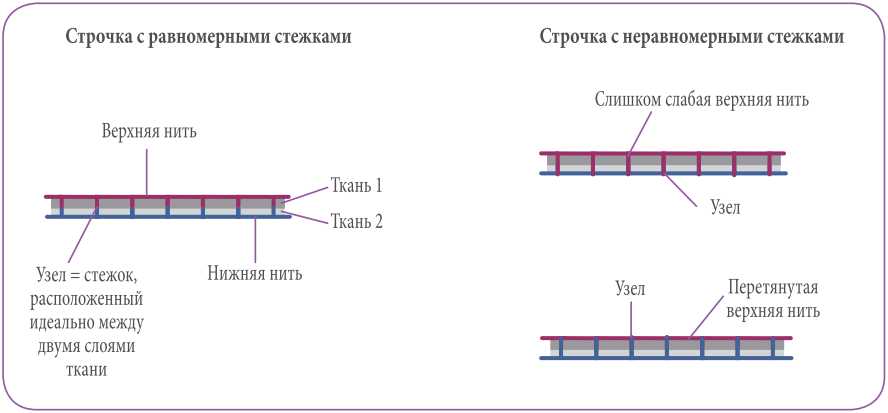 Если нижняя нить видна с лицевой стороны, или верхняя нить — с изнаночной, если ткань морщится, это значит, что натяжение нити отрегулировано неправильно. Понемногу увеличивайте или уменьшайте натяжение верхней нити: делайте пробные строчки на лоскутке ткани, пока не найдете подходящую настройку.