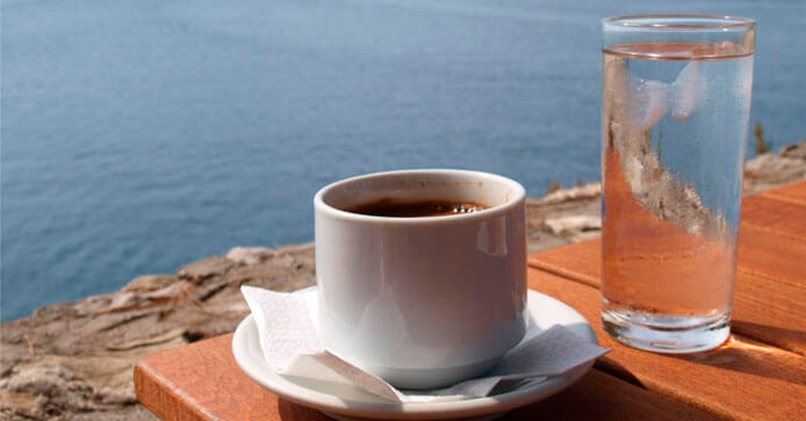 - Кофе из джезвы получается довольно крепким, поэтому его принято подавать со стаканом прохладной воды. Такой ритуал продливает приём кофе, а также помогает восполнить водный баланс, так как бодрящий напиток имеет мочегонный эффект. Кто-то считает, что, если пить кофе маленькими глотками и запивать холодной жидкостью, бодрящий эффект даже усиливается.