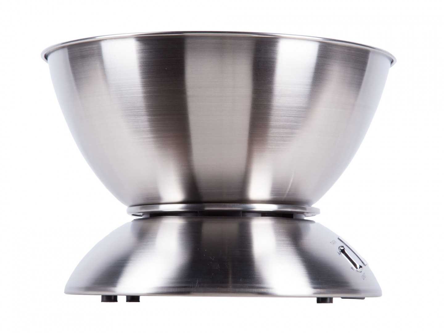 Двухлитровая чаша и корпус изделия – металлические. На передней стороне корпуса расположен ЖК-экран и кнопки управления. Максимальный вес составляет 5 кг. О перегрузе скажет индикатор на экране. С помощью удобной чаши можно взвешивать жидкие и сыпучие продукты.