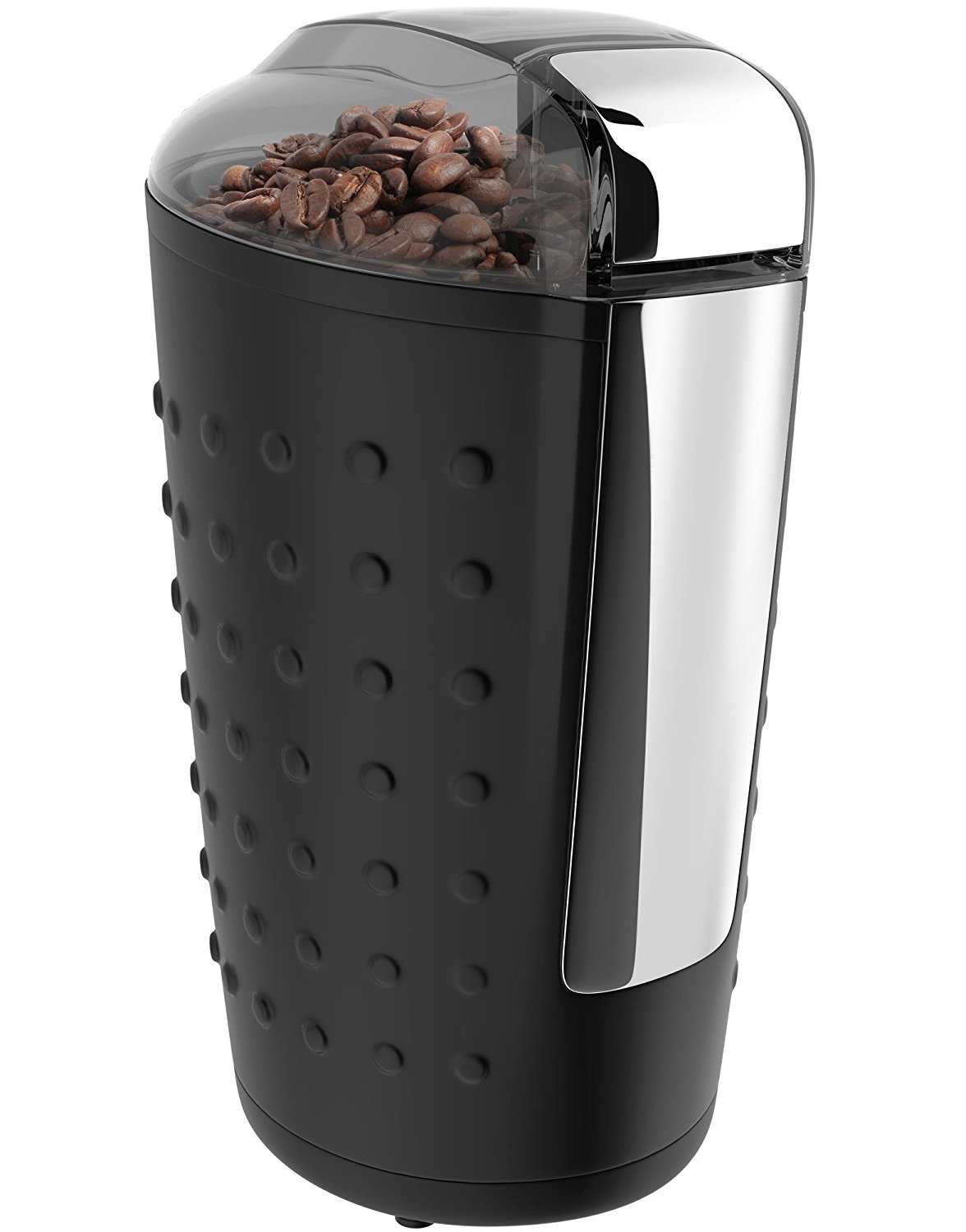 - Электрическая кофемолка производится в 2-х видах – ножевая и жерновая. Название говорит о том, что зерна кофе измельчаются с помощью ротационных ножей. Мотор спрятан внутри корпуса, а рабочая часть представлена в виде небольшой емкости для засыпания кофе. Достичь равномерного помола очень затруднительно. Кофемолка для дома современного образца имеет функцию регулировки помола, однако на рынке они продаются в ограниченном количестве. Ножевые кофемолки относятся к опасным, так как нужно внимательно следить закрыта ли крышка прибора, чтобы избежать ранения.Осуществлять помол лучше интенсивно, а не при постоянно включенном моторе. Они имеют существенный недостаток – после помола порошок “забивается” под ножи, а извлекать его нужно подручными средствами.