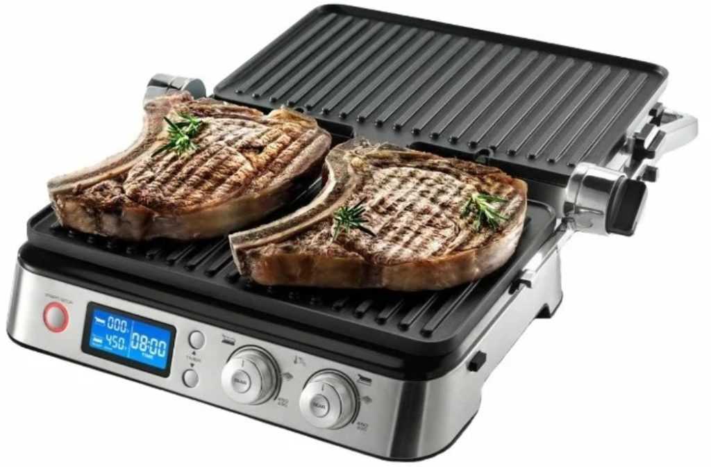 Модель имеет 9 программ приготовления, а также самостоятельно регулирует температуру в зависимости от продукта, его толщины и величины. С таким устройством больше не понадобятся сковородки –зачем, если гриль может приготовить блюдо без вашего участия.