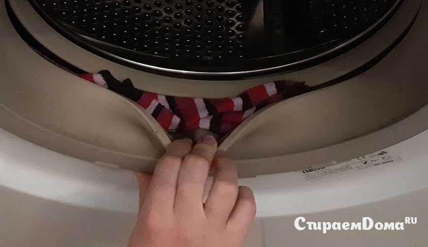 Пространство под резиновой манжетой. Уплотнитель обеспечивает герметичность, закрывая собой щель между барабаном и корпусом. Однако со временем или из-за плохого ухода резина растягивается, теряет эластичность. Во время работы машинки она вибрирует, обнажая зазор. В него-то и засасывает носки. Вторая причина — слишком большая загрузка белья в барабане. Когда бак переполнен, манжета из-за сильной нагрузки растягивается, сдвигаясь с места. Результат тот же.