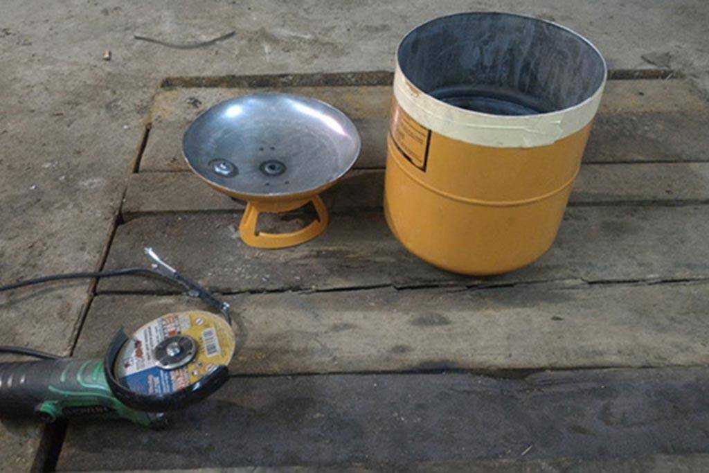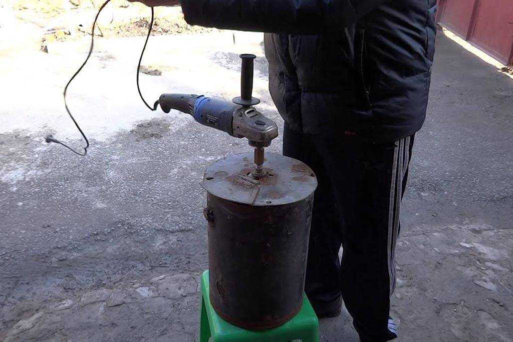 - В металлической емкости делают 2 крупных отверстия диаметром 10 см: сбоку – для выхода готового сырья, снизу – для подведения рабочего инструмента УШМ.