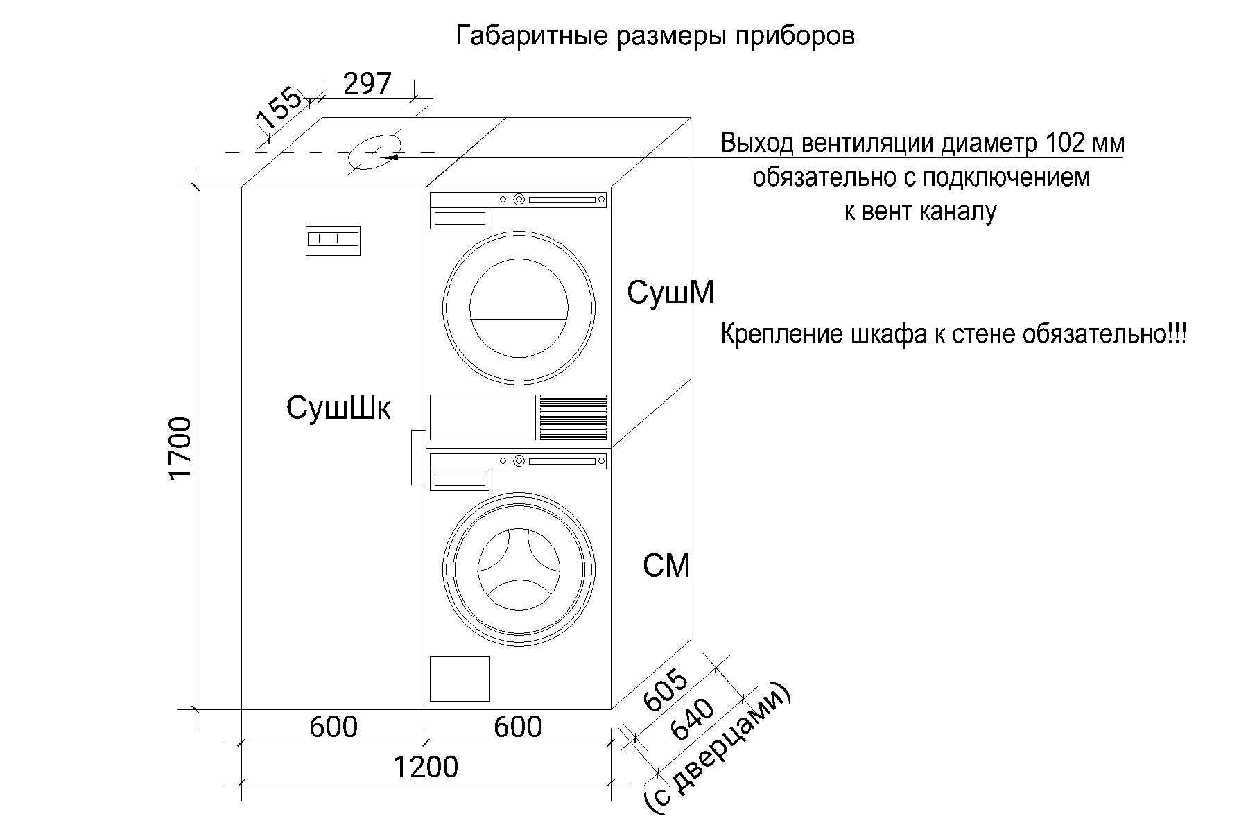Сушильную машину или колонну можно расположить вплотную к вытяжке и канализации, и при этом провода и шланги окажутся скрытыми от глаз.