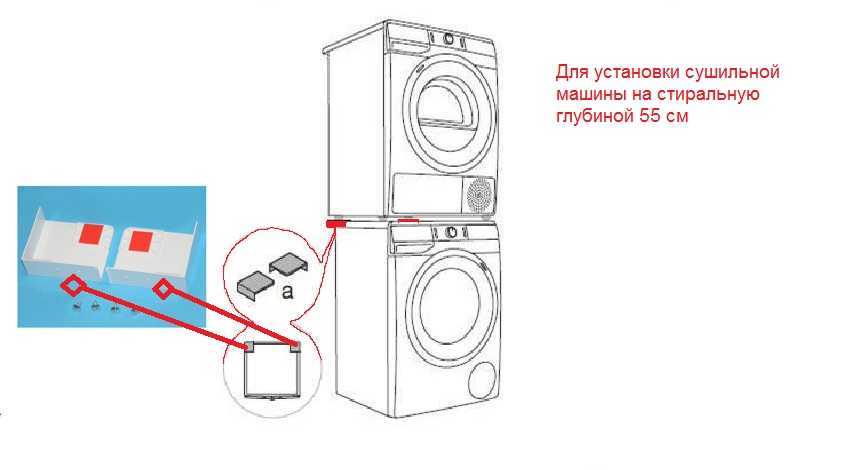 производители предлагают комплекты из двух агрегатов с крепежными деталями, что значительно облегчает установку, обеспечивают безопасность и надежность конструкции; некоторые бренды, например, Бош, Сименс, Аско и Горение выпускают машины, рассчитанные на размещение в колонне, где корпус стиральной машины усилен специально под массу сушильного аппарата; соединительные планки таких конструкций специально предназначены для гашения вибраций и сохранения устойчивости; у моделей от Бош и Сименс может быть предусмотрена выдвижная полка, у Аско такая полка оснащается специальной корзиной для белья; сушильные агрегаты от Аско снабжаются дополнительными креплениями для ножек, у словацкой Горения предусмотрены ножки присоски; несомненным преимуществом выбора моделей одного бренда является стилевое однообразие и одинаковые габариты, последнее условие особенно важно для сохранения устойчивости; при выборе узких вариантов под небольшую площадь следует учитывать, что минимальной глубиной обладают устройства от Аско, с учетом обязательного свободного пространства сзади, она составляет 65,6 см. В случаях когда размещение в колонну не допускается, в инструкции указывают минимум расстояния сверху, которое необходимо для работоспособности устройств