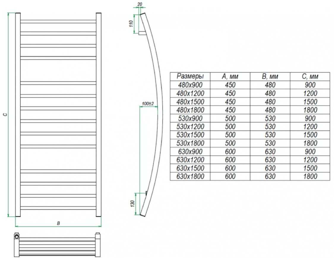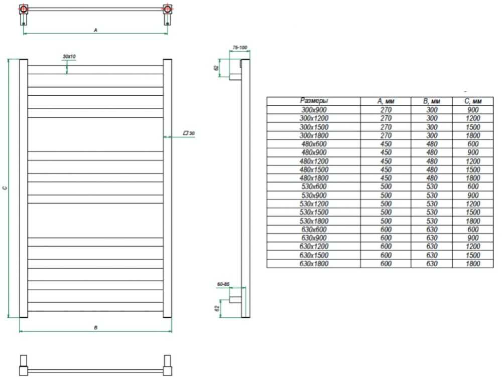 Как грамотно разместить полотенцесушитель на стене, чтобы в него не упиралась стиральная машинка, и трубы не загораживали электрические розетки? Нужно узнать габаритные размеры. Приведём их в формате таблицы: