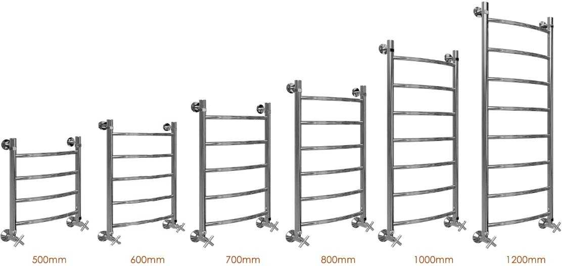 У сантехнических приборов, в виде лесенки, чаще – наоборот, высота больше длины. Например, при ширине конструкции, равной 50 см, вертикальный габарит колеблется от 60 см – до 130 см. При этом, ширина тоже может изменяться.
