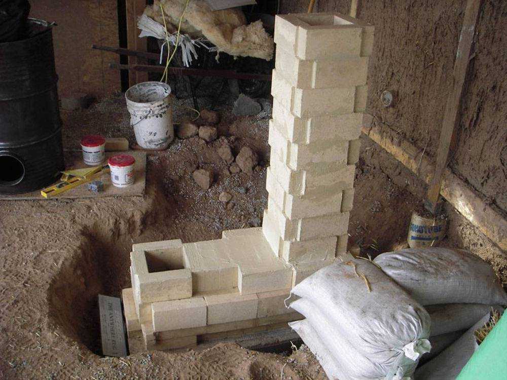 При использовании подтесанных шамотных кирпичей, оставшиеся полости заполняют песком. Если для футеровки используется только песок, его просеивают от крупного мусора и засыпают слоями – каждый примерно на 1/7 высоты трубы. Каждый слой плотно трамбуют и сбрызгивают водой, чтобы образовалась корка. Засыпку необходимо просушить в течение недели, а затем замазать торец слоем печной глины. Затем продолжается постройка ракетной печи своими руками по чертежам.
