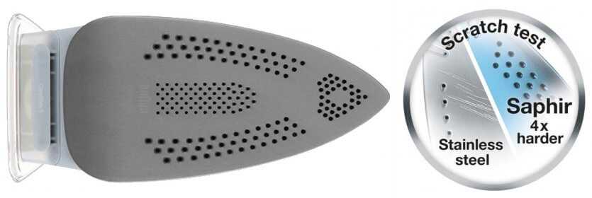 Утюги с титановым покрытием обладают высокой прочностью и качеством глажки, но дорого стоят. Аналогом дешевле считается разработанная фирмой Braun подошва Saphir. Не думайте, что покрытие утюга сделано из сапфиров. Оно представляет собой сплав хрома, цинка, никеля и алюминия, который в несколько раз прочнее стали. Благодаря прочности, аналогичной прочности сапфира, покрытие получило такое название, и само отполировано сапфировой крошкой. Производитель гарантирует минимум восьмилетний срок службы утюга при каждодневном использовании.