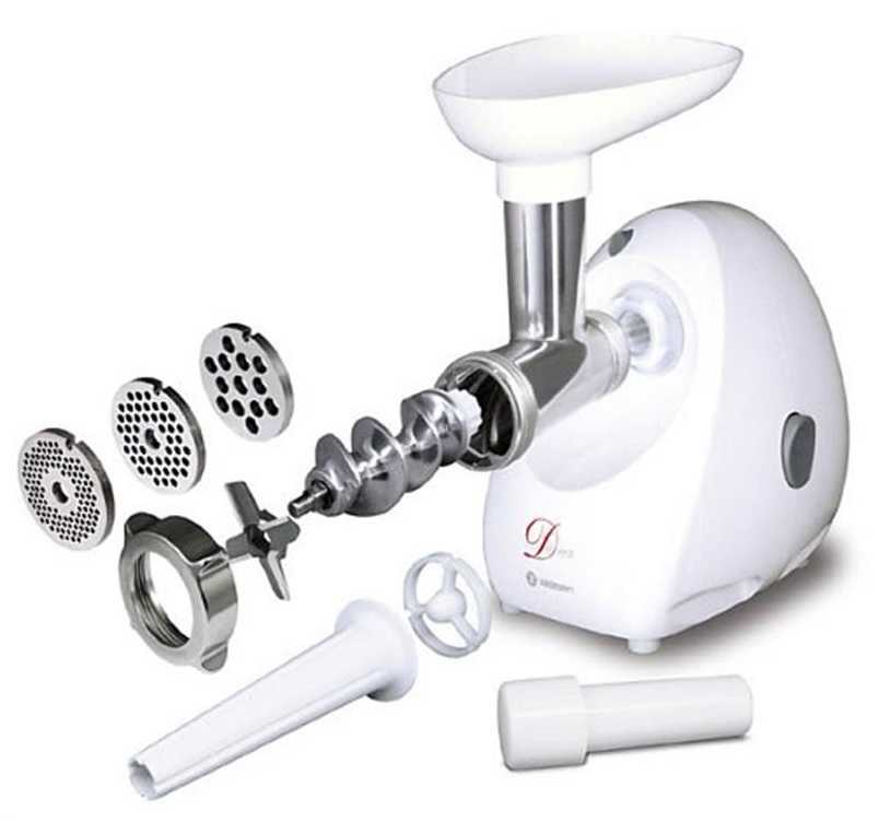- Дополнительные опции. В комплекте с некоторыми приборами идет целый арсенал насадок и приспособлений, значительно расширяющий возможности устройства. Так, некоторые мясорубки умеют шинковать, перетирать, формовать, выжимать сок из мясистых плодов и цитрусовых.