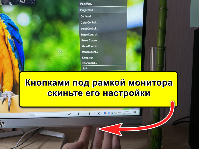 Нередко вертикальные и горизонтальные полосы на мониторе появляются из-за аппаратных неполадок. Порой, причиной становятся некорректные настройки. Поэтому прежде чем проверять матрицу, сбросьте все настройки монитора до первоначальных.