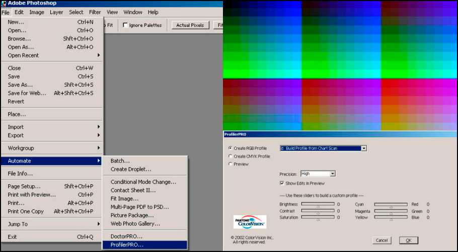 - открыть сканкопию в Adobe Photoshop, при этом в меню ProfilerPro напротив Create RGB Profile выбрать d. Build Profile from Chart Scan;