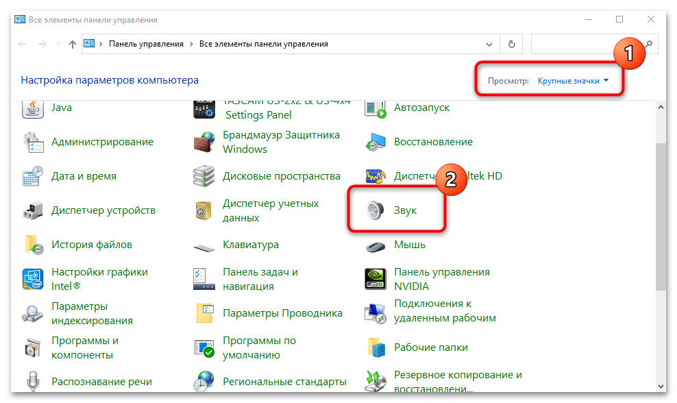 Нажмите на раздел «Звук», предварительно выбрав отображение параметров в качестве крупных или мелких значков.