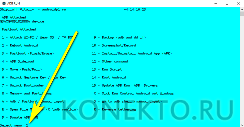 Скачать (ссылка — clouds.androidp1.ru), инсталлировать и запустить программу Adb Run, после чего подсоединить телефон или планшет к компьютеру при помощи USB-шнура, желательно — идущего в комплекте с устройством. Дождаться авторизации смартфона и перейти в раздел Reboot Android, введя в диалоговой строке цифру 2 и нажав на Enter.