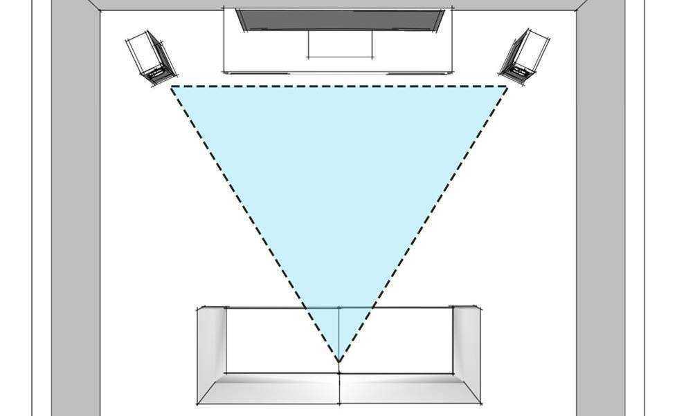 Базовый принцип, без которого невозможно добиться хорошей сцены и образности, таков: точка прослушивания и колонки должны располагаться по схеме равностороннего треугольника. Слушатель должен сидеть точно между двумя акустическими системами (эта точка называется «зоной комфортного прослушивания»). Расстояние до каждой колонки должно быть лишь немного большим, чем расстояние между самой акустикой. Если этот основной принцип не соблюден, то о хорошей звуковой сцене не может быть и речи.