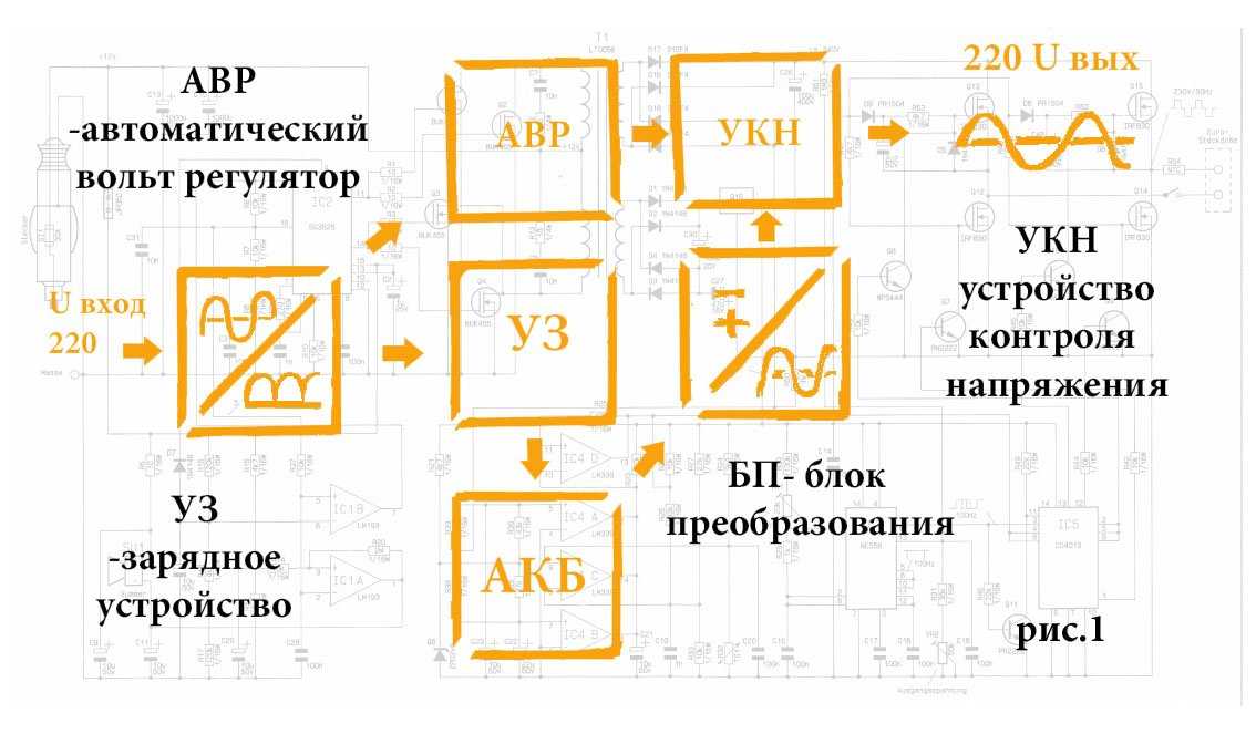 Химические источники напряжения, аккумуляторы, способные хранить заряд электричества в течении длительного времени, обеспечивают постоянное напряжение, слишком низкое для питания бытовой техники: 2 вольта, 6 вольт, 12В и т.д. Инверторы преобразуют постоянное напряжение от аккумуляторов в переменное 220В или 230В в зависимости от конструкции и настроек. На этом основана работа всех ИБП!