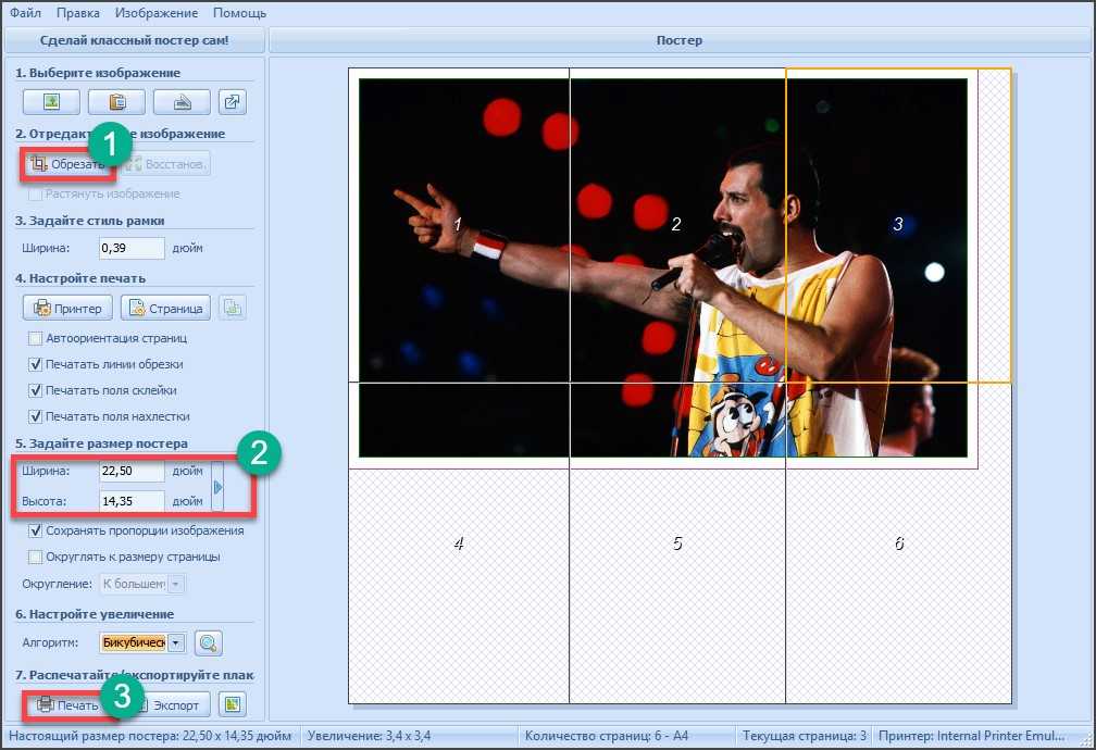 Теперь можно отредактировать изображение, обрезать его, задать размер постера и так далее. После этого нужно просто нажать на кнопку «Печать» .