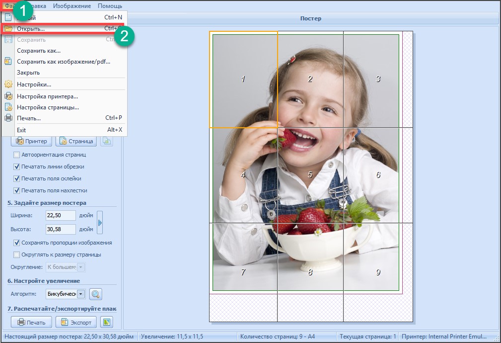 Чтобы убедиться, что программа правильно разбила картинку на части для печати, используйте предварительный просмотр. Если ошибок нет, можно приступать к изготовлению постера.