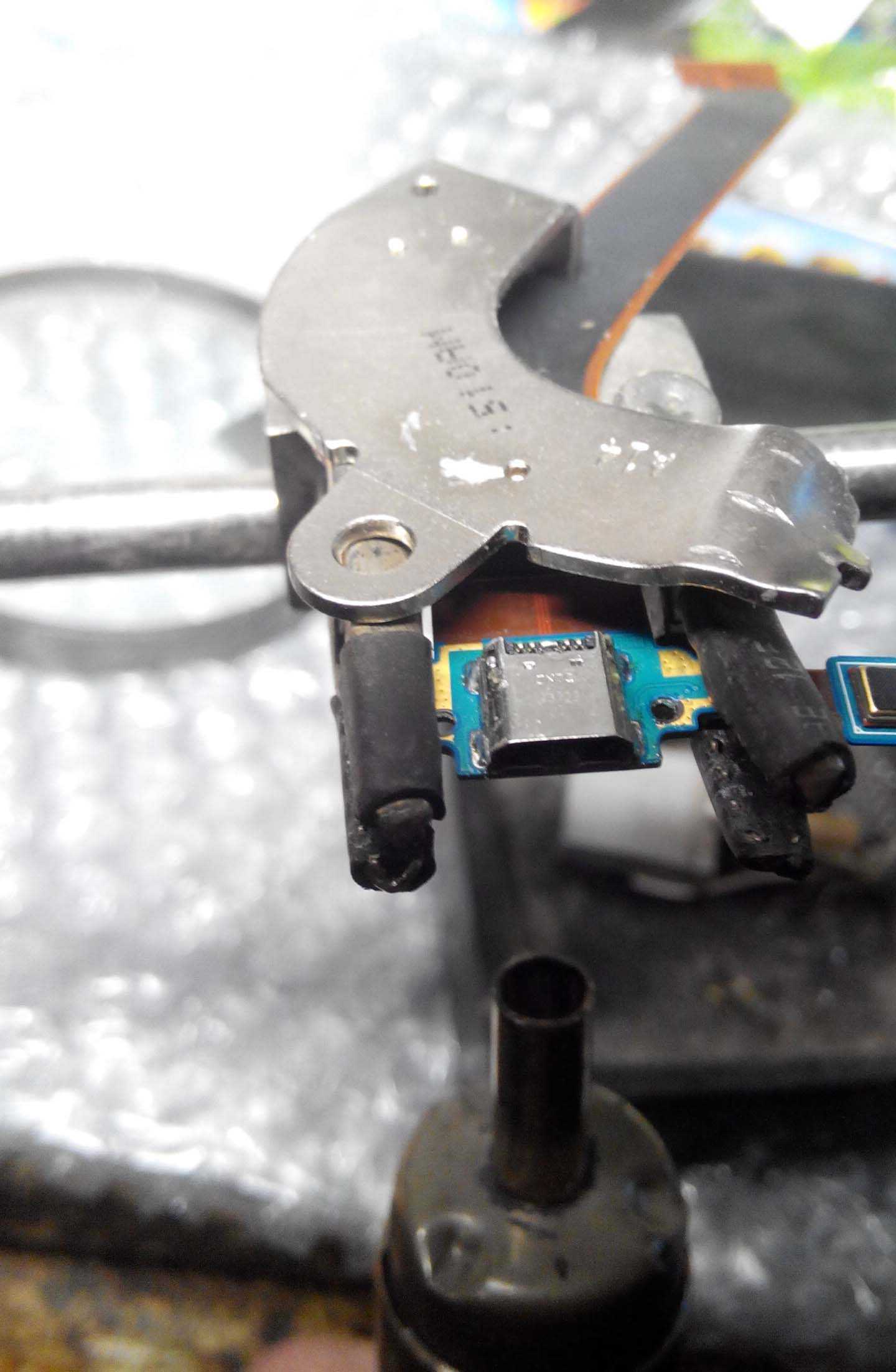 Выпаивал разъем с помощью паяльного фена. Выставив на нем температуру 380 градусов, и воздух больше среднего, начал подогревать разъем снизу.