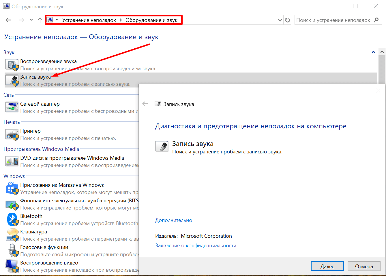 - Запускаем поиск и устранение неполадок «Запись звука».
