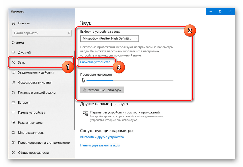 Способ второй — через «Параметры». Открываем раздел «Система», переходим на вкладку «Звук», находим устройство записи и нажимаем на кнопку «Диагностика неполадок».