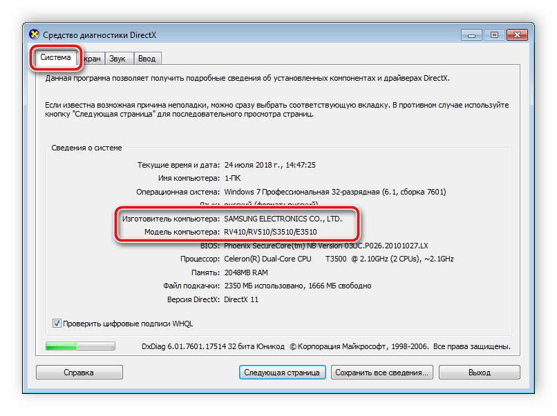 Раз уж мы пошли по системным утилитам, не пройдем мимо средства диагностики DirectX. Несмотря на неявное отношение к вопросу определения модели ноутбука, здесь тоже можно найти все необходимые сведения: