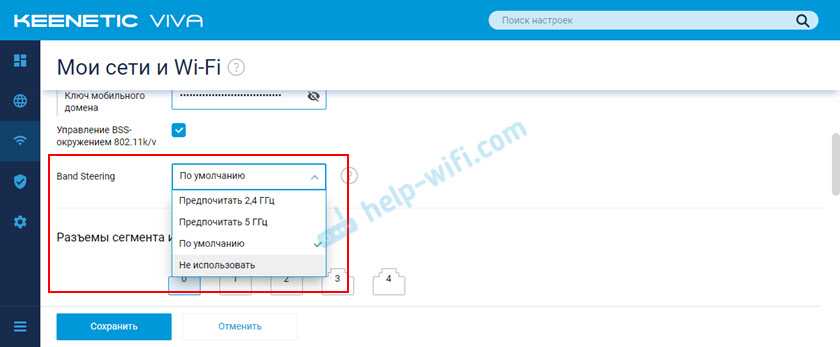 По умолчанию включена функция Band Steering. Она синхронизирует настройки Wi-Fi в диапазоне 2.4 и 5 ГГц и устройства видят одну сеть. Выбор диапазона происходит автоматически. Если вы хотите задать разные настройки Wi-Fi для сети на 2.4 ГГц и 5 ГГц, то Band Steering нужно отключить.