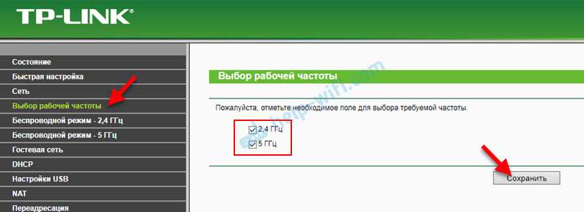 - Если у вас зеленый интерфейс от TP-Link, выберите настройку Выбор рабочей частоты и укажите, какие диапазоны Wi-Fi вы хотите использовать: только 2.4 ГГц, только 5 ГГц или оба одновременно. Соответственно, для того, чтобы полностью переключить роутер на 5 GHz, необходимо отключить частоту 2.4, оставив только диапазон 5 гигагерц.