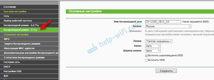- Если у вас роутер TP-Link с синим интерфейсом, выберите Базовая настройка > Беспроводной режим и установите флажок Включить беспроводное вещание напротив опции Беспроводной режим 5 ГГц: