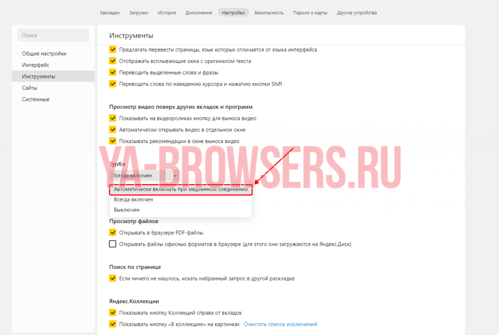 Как было сказано выше, при активированной опции ускорения Яндекс сжимает контент для его быстрой загрузки, но при этом скачиваемые видео, музыка, картинки теряют в качестве. Для того, чтобы постоянно не отслеживать скорость интернета и не включать/отключать, разработчики позаботились об автоматической смене вариантов работы интернет обозревателя.