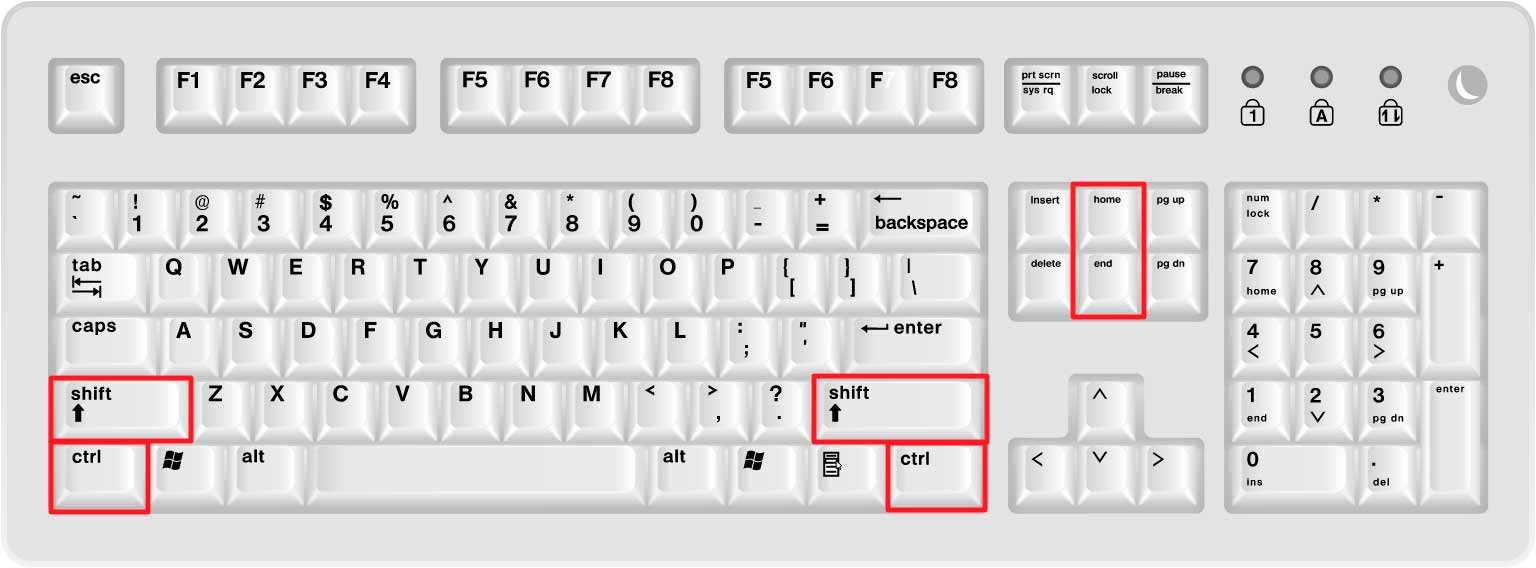 - Ctrl + Shift + стрелка вправо/влево : слово.