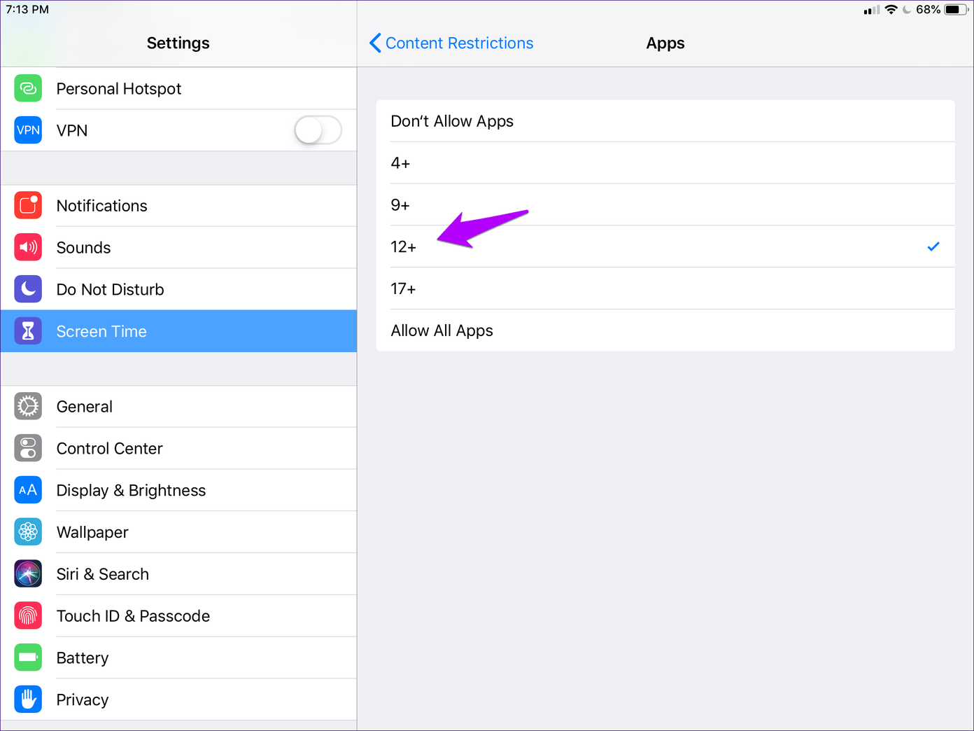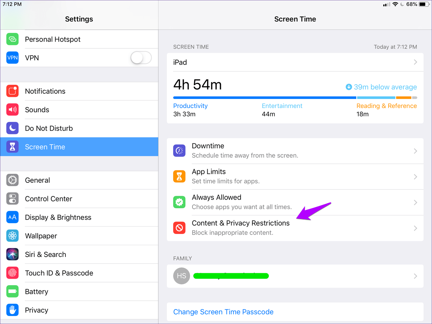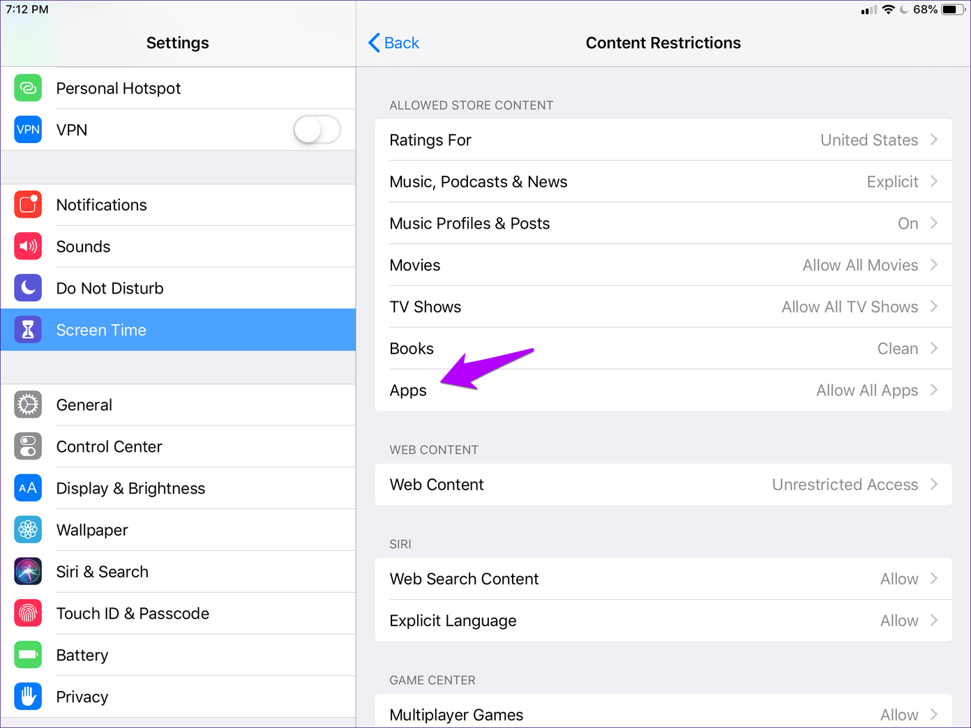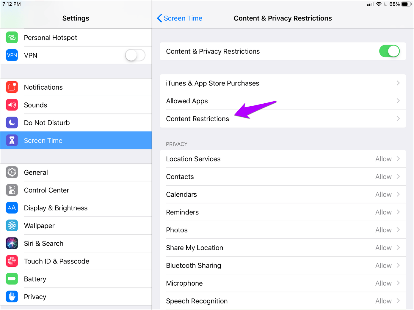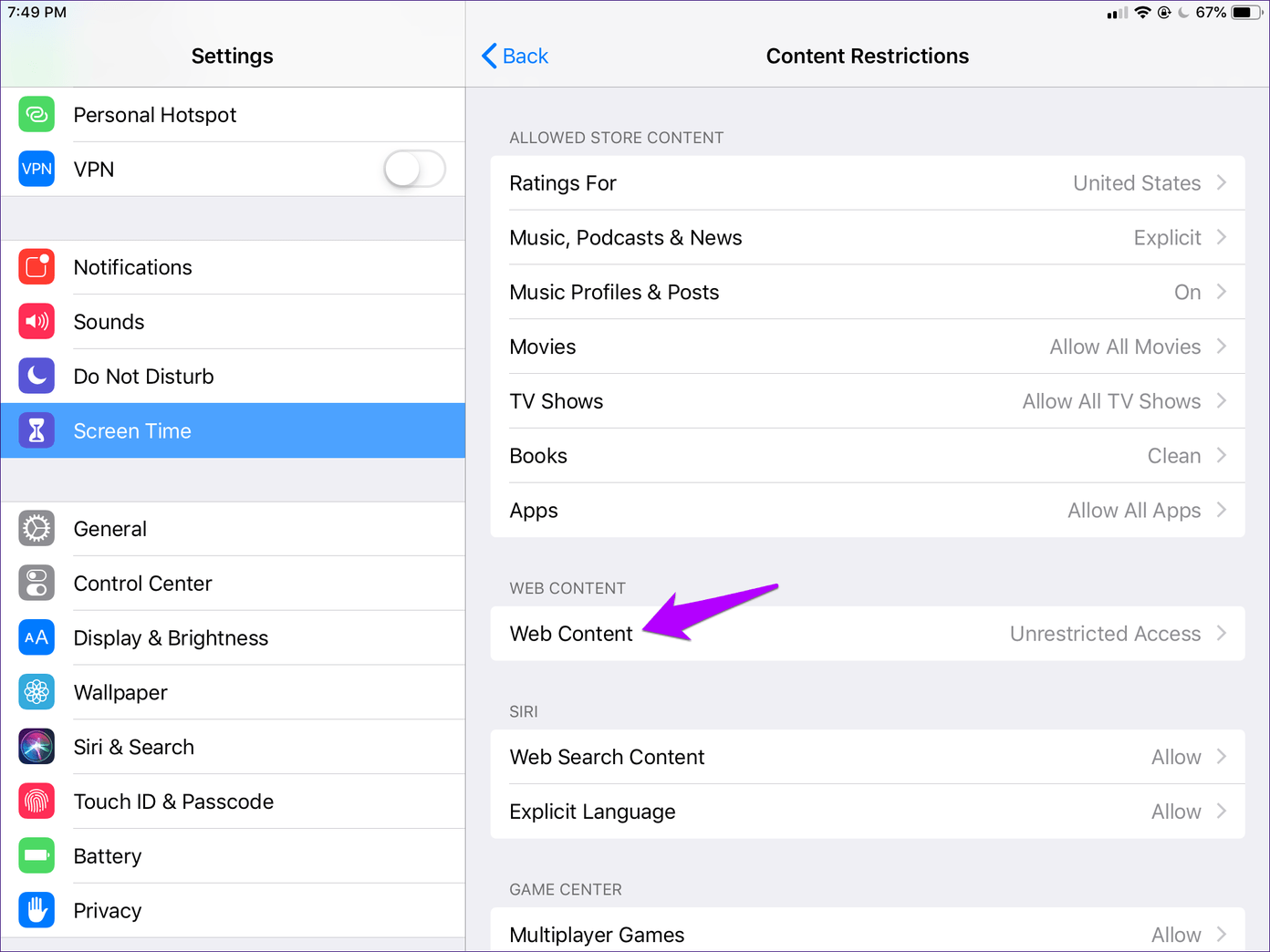 Шаг 1. На панели «Время экрана» нажмите «Ограничения содержимого и конфиденциальности», нажмите «Ограничения содержимого», а затем нажмите «Веб-содержимое».