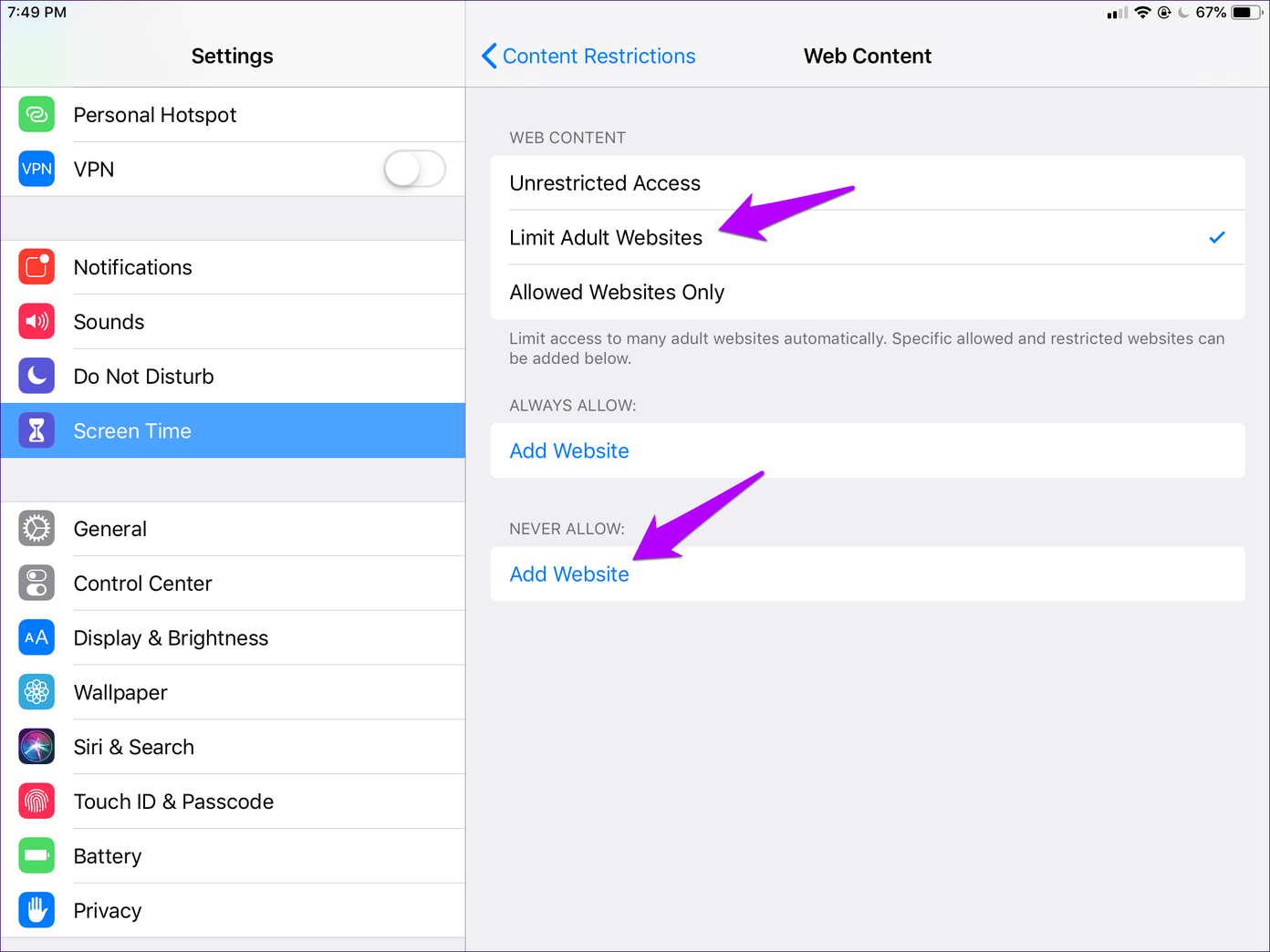 Шаг 2. Нажмите «Ограничить веб-сайты для взрослых», а затем нажмите «Добавить веб-сайт» в разделе «Никогда не разрешать».