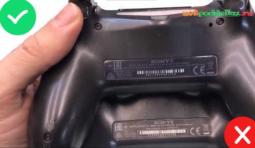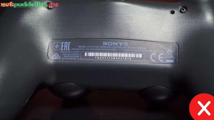 У оригинального джойстика обязательно присутствует информационная наклейка. Она располагается в нижней части тыльной стороны геймпада и имеет вытянутую прямоугольную форму. Шрифт на этикетке легко читается, несмотря на то, что он нанесен не контрастным цветом. Наклейку невозможно подцепить ногтем и оторвать, так как она плотно приклеена.