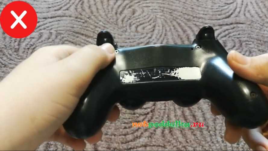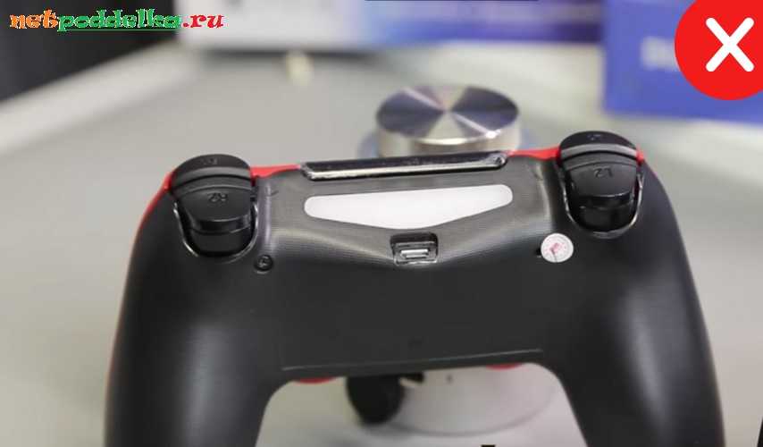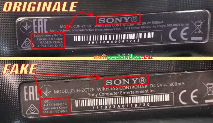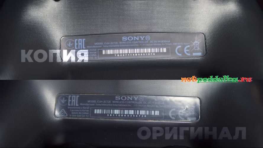 Оригинальный Дуалшок 4 имеет лишь одну прямоугольную вытянутую информационную этикетку. У подделок нередко имеются другие наклейки. На многих копиях можно встретить заклеенный шуруп эмблемой псевдогарантии.