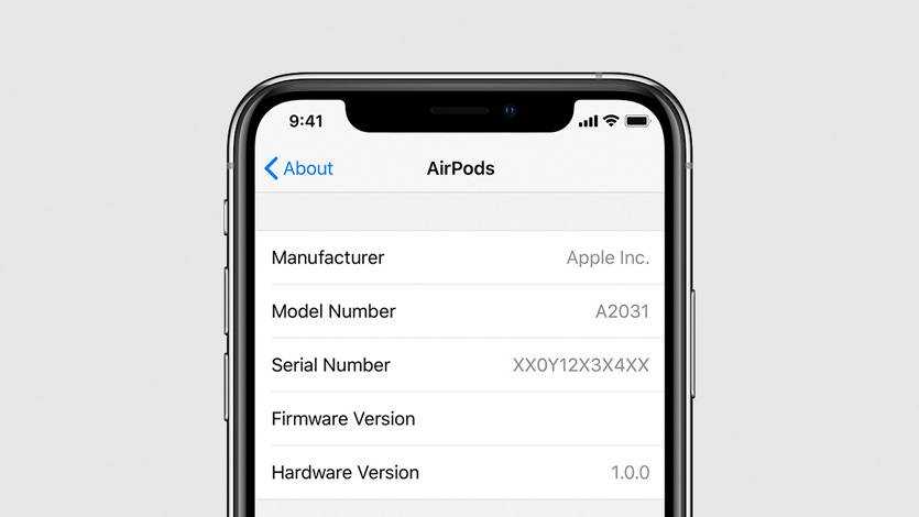Когда наушники подключены к iPhone, их номер модели можно найти в меню «Настройки» > «Основные» > «Об этом устройстве» > AirPods — здесь же есть их серийный номер и версия прошивки.