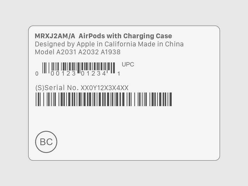 Возле номеров наушников на этой наклейке также указана модель зарядного кейса: вторые AirPods могут быть как с обычным чехлом, так и с тем, который поддерживает беспроводную зарядку.